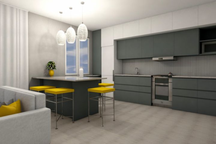 Один из вариантов планировки кухни в частном доме. Эскизная визуализация