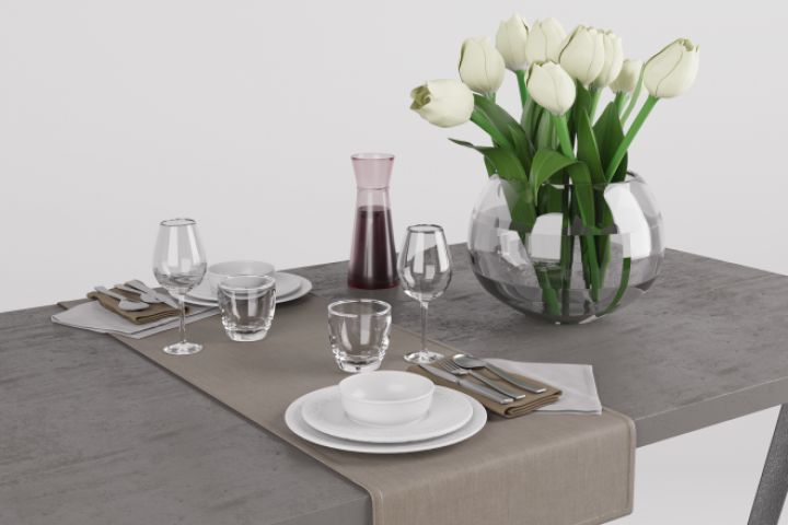 Модели небольшого столового сервиза и вазы с цветами выполнены для проекта визуализации современной столовой.