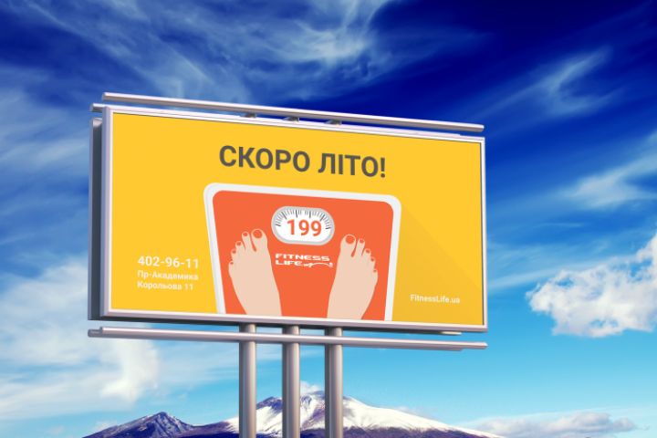 Необычная реклама билбордов для FitnessLife. Подготовка к лету, мотивация людей и продвижение бренда в Киеве.