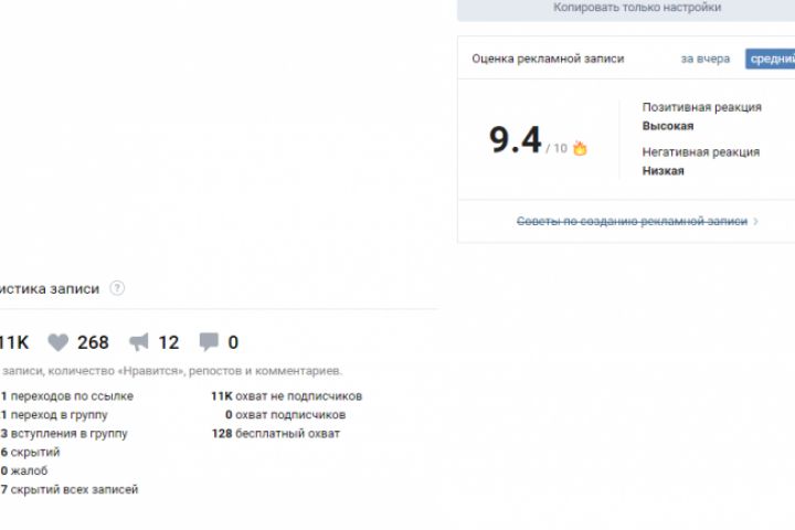 Продвижение сообщества в соц. сети VK.com: Позитивная реакция на объявление - высокая, 9.4 из 10! 123 вступления в сообщество по этому креативу