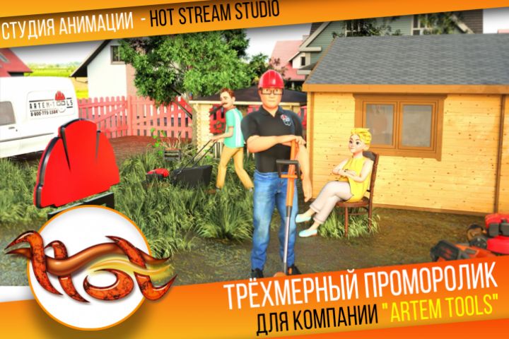 Для компании "Artem Tools" Разработали фирменного персонажа. В брендированных фирменных цветах. Зовут, разумеется - Артем. Прообраз основателя компании. Также в ролике присутствуют женщина и мужчина - 40-50 лет. Основная целевая аудитория компании.