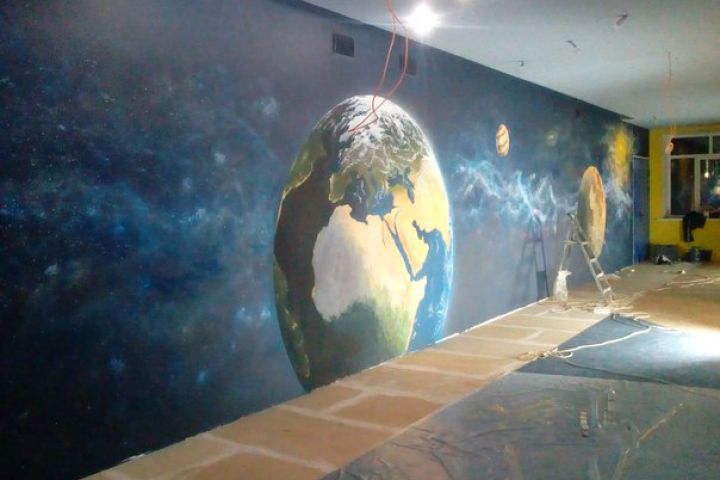 работа выполнена светящимися красками. и в полной темноте, космос выглядит еще более реалистичным. а звезды, планеты и млечный путь излучают свет. жаль, что фотография не передает этого.