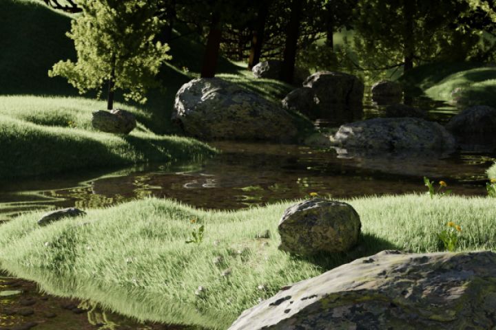 Это рекламный принт. Здесь находится нужное количество травинок, камней и листьев. 3D художник может перемещать реку, чтобы получить идеальную картинку. Создавая любые изображения в 3D.
