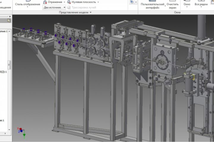 Изготовлен и работает на предприятии заказчика более 2 лет. Комплекс предназначен для изготовления ручек строительного инструмента из проволоки до Ф8 мм. В состав комплекса включены механизмы: протяжной, правильный, плющильный штамп, обрубной штамп, гибочная головка, фрезерная головка.