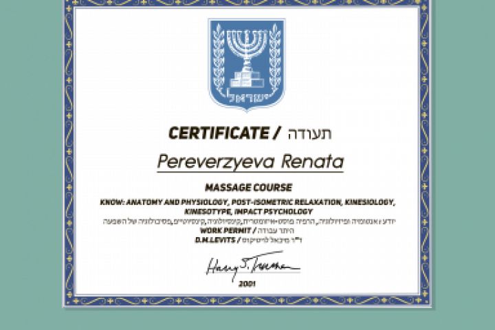 Cертификат об окончании курсов массажа.