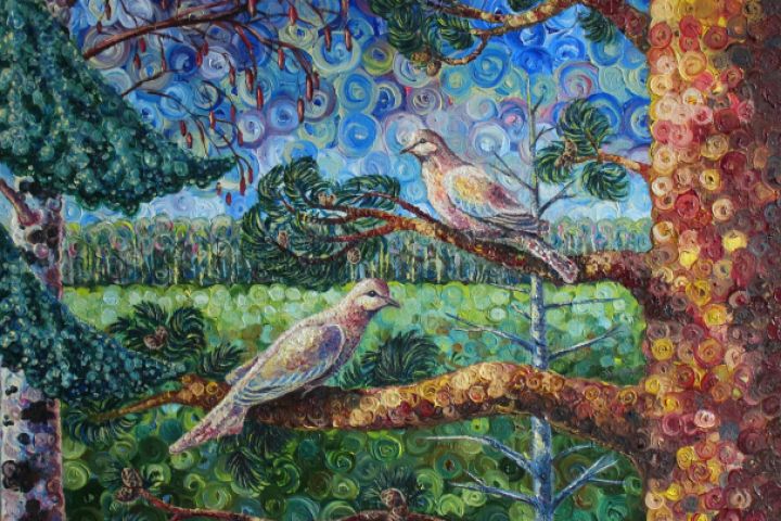 Горлицы-это изящные дикие голуби. Я впервые увидела этих птиц на Кубе, в клетке. Такие прекрасные создания должны летать, жить на воле, а не сидеть взаперти. И так они мне запали в душу, что я захотела их написать и увидеть в нашем Российском, даже быть точнее Карельском лесу.