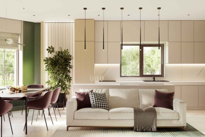 Визуализация кухни-гостиной в одноэтажном загородном доме. Заказчики хотели светлое пространство со стильным декором, которое не требовало бы больших затрат. В данном помещение выполнено зонирование. Мы видим зону кухни в большой рабочей поверхностью, обеденную зону с большим столом и акцентной стеной, а так же зону ТВ, которая хорошо просматривается с дивана, стола и барной стойки.