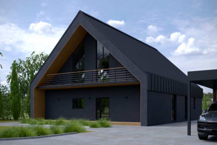 Заказчик - приверженец современного стиля. Вариант в минималистичном исполнении был утвержден сразу. В лаконичный объем как бы встроены уличные зоны отдыха - террасы с парадной и задней сторон здания. Отделка фасадов выполнена по системе мокрый фасад /штукатурка/ цвета графит и обшивка планкеном из ясеня натурального цвета в зоне террас. Отделка кровли - фальцевые листы в цвет фасада, графит. Водоотведение с кровли - скрытая водосточная система, водосток устанавливается в конструкции стены.