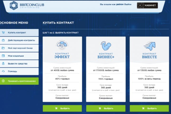 - пользователи имеют возможность купить в личном кабинете контракты в биткоинах или эфириумах, а также смотреть всю информацию по ранее купленным контрактам (название и сумма контракта, дата начала, дата окончания, полученная доходность, потенциальная доходность); контракт активируется после подтверждения администратора