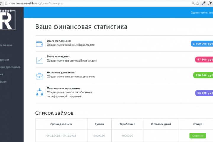 - реализована реферальная программа (каждый инвестор имеет уникальную ссылку, все другие инвесторы, которые зарегистрируются по данной ссылке, являются рефералами данного инвестора; реферальный спонсор получает по 10% до 3-го поколения от суммы заработанных всеми его рефералами денег)