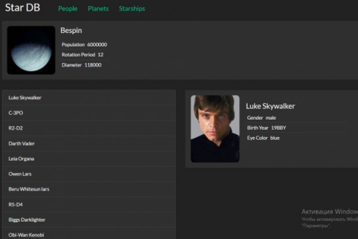 SrarDB - это приложение для поклонников звездных войн, имеется три страницы на которых можно посмотреть какие персонажи , корабли и звёзды были в сериале с их подробным описанием. Присутствует работа с сторонним API , React-Routing, React Hooks.