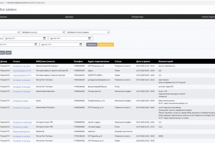 - добавление/редактирование/удаление заявок на подключение к интернету