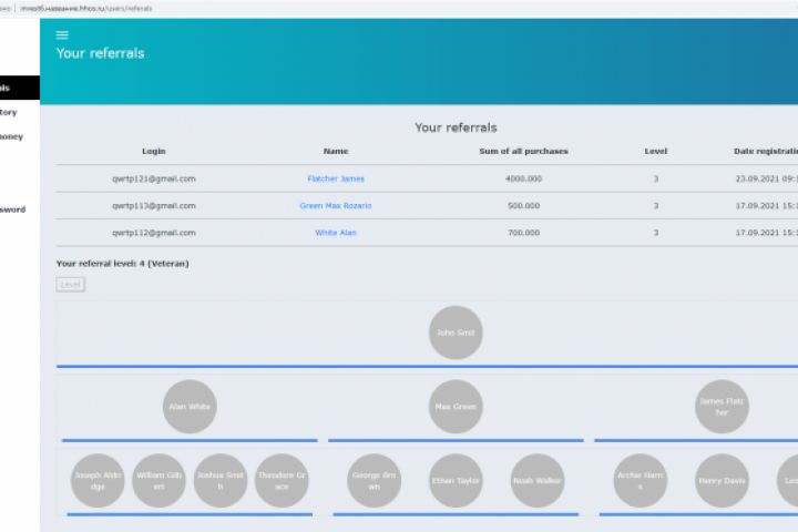 - смотреть своё реферальное дерево (раздел "Your referrals"), а также деревья своих рефералов (если в дереве нажать на любого реферала, происходит загрузка той части дерева, в которой данный реферал стоит вверху)