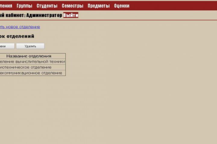 Все указанные выше данные (отделения, группы, студенты, предметы, семестры, оценки) могут быть отредактированы или удалены.