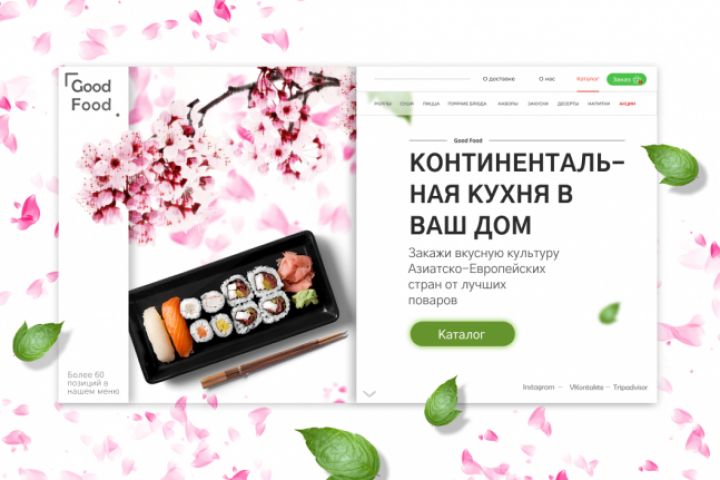 Обязательное условие - интерактивная карта с выделенными зонами доставки, меню с товарными позициями, корзина, возможность оформления заказа. Благодаря элементам декора, лепесткам и листикам, получилось создать легкий и светлый дизайн сайта с восточными нотками, так как заказчик просил сделать упор на азиатскую кухню.
