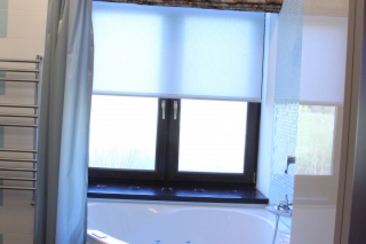 Римская штора, как декор. Для закрытия используется солнце защитная система - ролл. Штора для ванной - заказная ткань, водонепроницаемая.