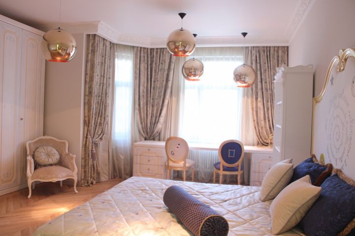 Покрывало и декоративные подушки выполнены из тканей компаньонов в сочетании со шторами