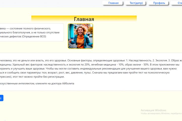 Сайт, который призван улучшить ваше здоровье за счет правильного питания и физических упражнений. Дается оценка здоровья по 4-ем тестам. Искуственный интелект ответит на любые вопросы. Периодически публикуются статьи о здоровье. На форуме можно высказаться и комментировать другие сообщения.