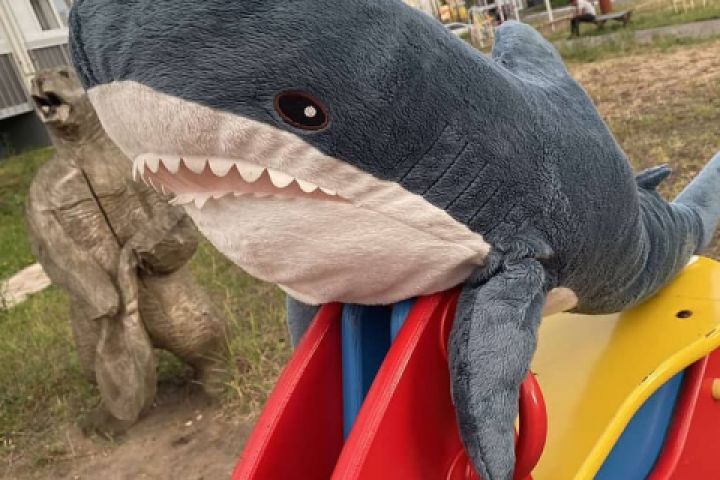 Акула из икеи Блохей лежит на детском аттракционе "мотоцикл" во дворе.