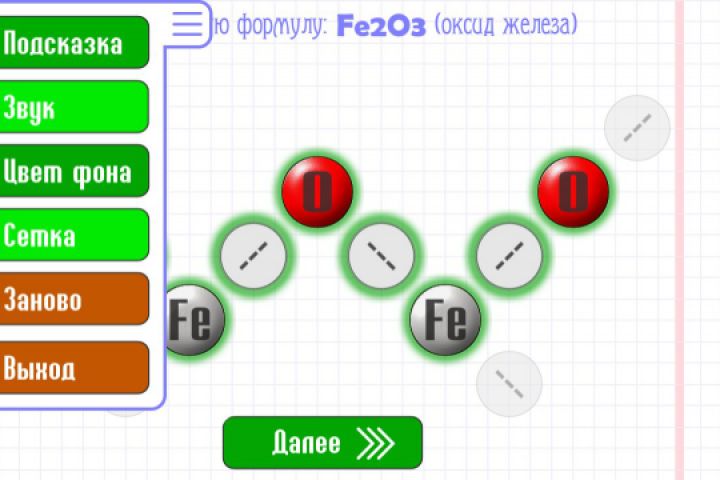 Конструктор структурных химических формул. Задача игрока - правильно собрать структурную формулу заданного вещества из набора атомов и связей. Доступны 2 режима сложности: обучение и тестирование,