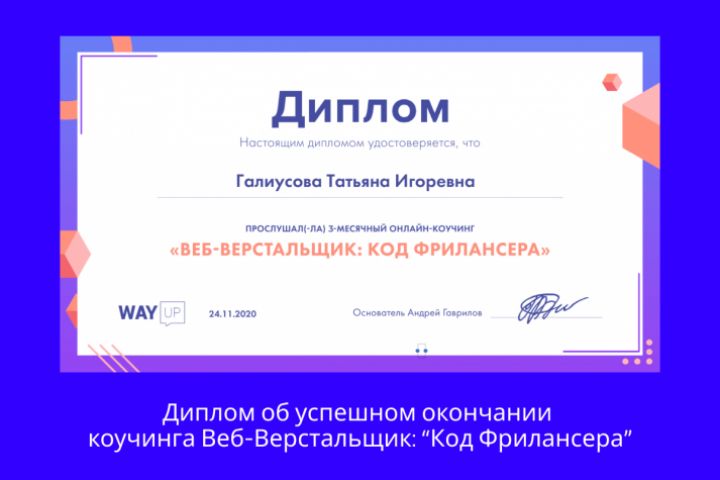 Диплом об окончании коучинга Веб-Верстальщик: “Код Фрилансера"