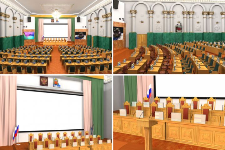 Моделирование Зал регионального собрания (второй вариант) Также в рамках проекта делался дизайн других помещений и видеоролик с обзором их всех