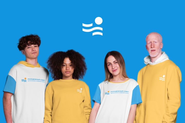 Айдентику подкрепляют яркие оттенки голубого и желтого цветов. Мы создали мерч, который полностью отражает географию округа и позитивный настрой молодежной организации.