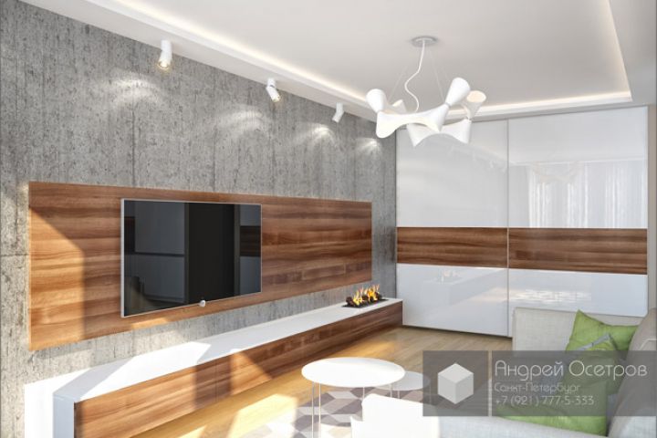Светлая студия. Использовали декоративный кирпич с покраской. Диван имеет спальное место и заменяет собой кровать. Почти вся мебель сделана из МДФ с покраской или оклейкой шпоном.