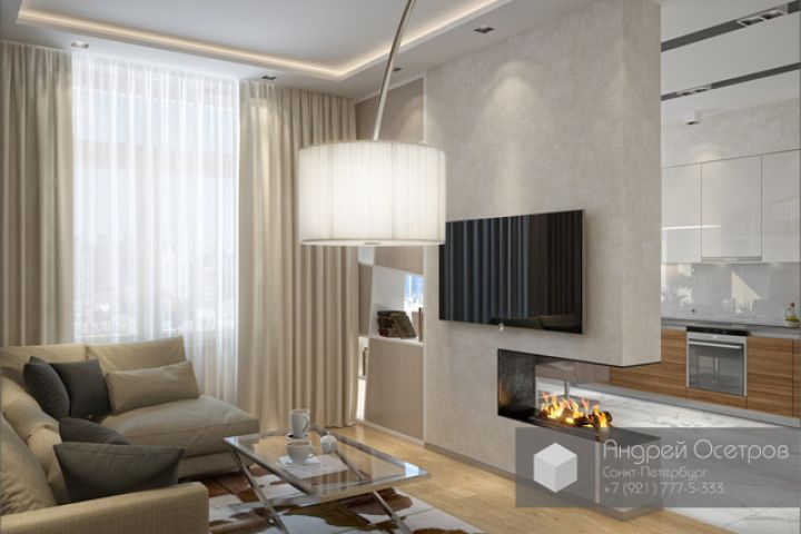 Интерьер кухни-гостиной разработан для молодой семьи с маленьким ребенком, поэтому камин использован безопасный для детей - электрический. Ломаная стена покрыта декоративной штукатуркой.
