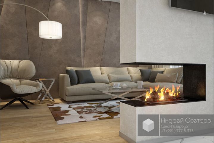 Интерьер кухни-гостиной разработан для молодой семьи с маленьким ребенком, поэтому камин использован безопасный для детей - электрический. Ломаная стена покрыта декоративной штукатуркой.