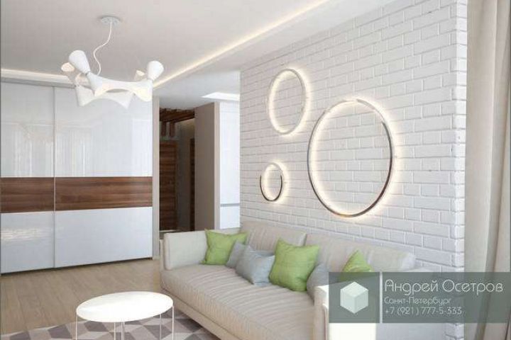 Светлая студия. Использовали декоративный кирпич с покраской. Диван имеет спальное место и заменяет собой кровать. Почти вся мебель сделана из МДФ с покраской или оклейкой шпоном.