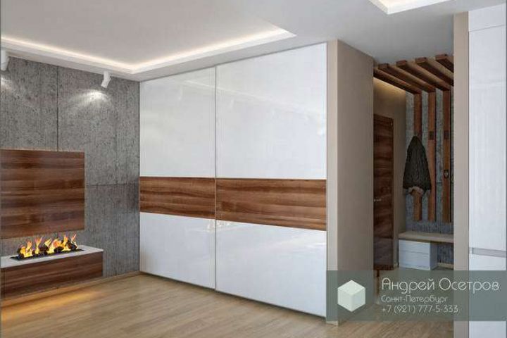 Светлая студия. Использовали декоративный кирпич с покраской. Диван имеет спальное место и заменяет собой кровать. Почти вся мебель сделана из МДФ с покраской или оклейкой шпоном.