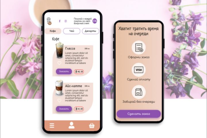 Дизайн мобильного приложения кофейни, основная функция которого - сделать предварительный заказ, оплатить его онлайн и забрать его без надобности стоять в очереди, так как заказ оформлен например за 15 минут до посещения кофейни.