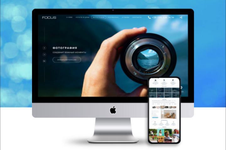 Дизайн сайта-портфолио для фотографа. Главный экран и разработан в тематике названия студии "Focus". Проработан блок с просмотром залов в каждой студии. Большой блок с портфолио и раздел с отзывами. Дизайн сделан в Figma