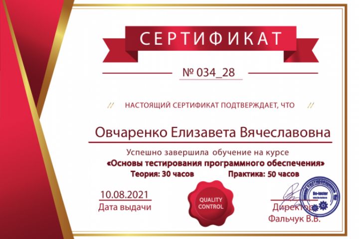 Прикрепляю сертификат о успешном окончание обучения курса «Основы тестирования программного обеспечения».