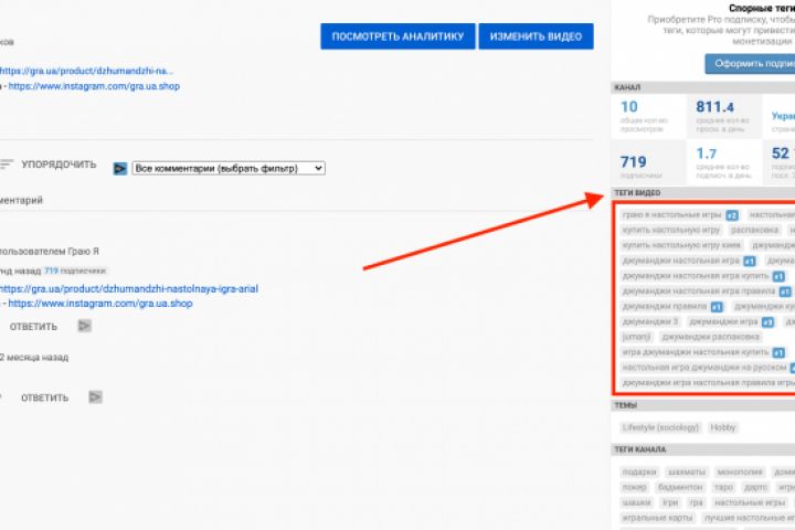 Хочу показать наглядный пример как помогают теги для продвижения видео на ютуб. На скриншоте в красной таблице вы видите обведенные теги видео, возле почти каждого тега стоит цифра , эта цифра показывает место в поиске по данному запросу. То есть, видео пробилось почти по всем тегам, соответственно хорошо ранжируется в поиске и приносит бесплатный целевой трафик владельцу видео.