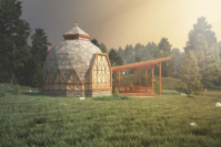 Баня в купольных конструкциях: купол диаметром 8 м возводится вручную из 2-х типов треугольных модулей из доски, заполненных эковатой, обшитых фанерой и покрытых гибкой черепицей. Здание стоит на лёгком ленточном фундаменте. Во внутренней отделке помещений используется вагонка. Планировка включает в себя все необходимые элементы банного комплекса: парная, моечная, душ, санузел, комната отдыха и спальня на антресольном этаже. На улице к бане пристроена веранда для летнего отдыха. Также разработан вариант для использования данного купола под дачный дом. В нём учтены следующие особенности: