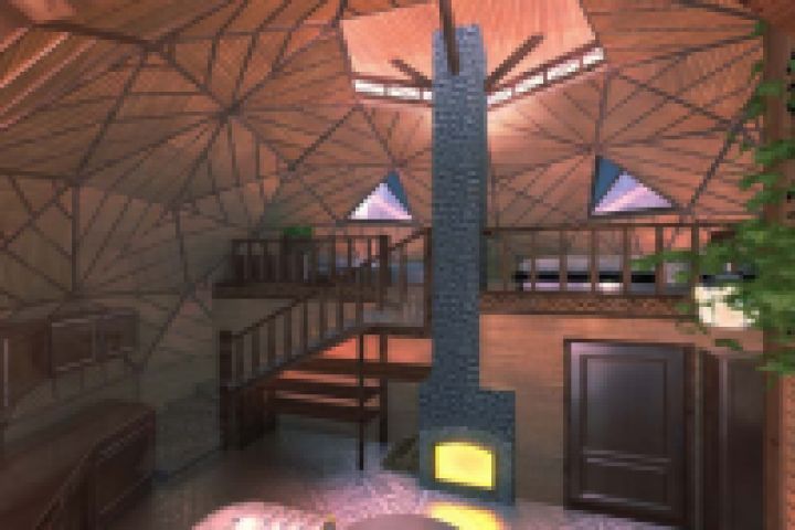 Баня в купольных конструкциях: купол диаметром 8 м возводится вручную из 2-х типов треугольных модулей из доски, заполненных эковатой, обшитых фанерой и покрытых гибкой черепицей. Здание стоит на лёгком ленточном фундаменте. Во внутренней отделке помещений используется вагонка. Планировка включает в себя все необходимые элементы банного комплекса: парная, моечная, душ, санузел, комната отдыха и спальня на антресольном этаже. На улице к бане пристроена веранда для летнего отдыха. Также разработан вариант для использования данного купола под дачный дом. В нём учтены следующие особенности: