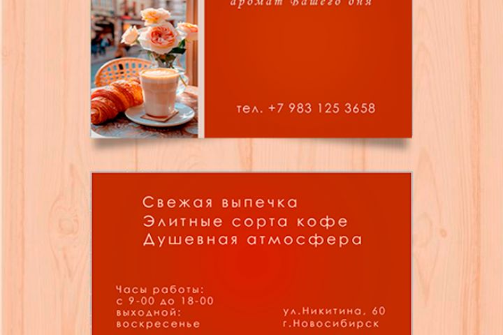 Созданный дизайн визитной карточки подчеркивает уникальный и привлекательный фирменный стиль кафе, обеспечивает запоминаемость среди конкурентов