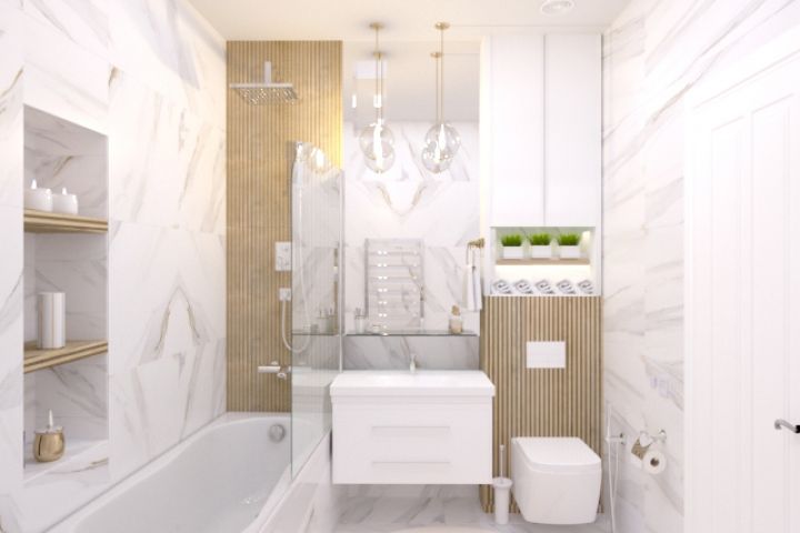 Уютная совмещенная ванная.На стенах керамогранит с красивейшим узором под мрамор и интересная испанская плитка с текстурой дерева.