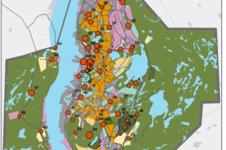 На карте представлено функциональное зонирование города Мурманск, а также визуализированы результаты отбора проб пыли (по результатам экспедиции).