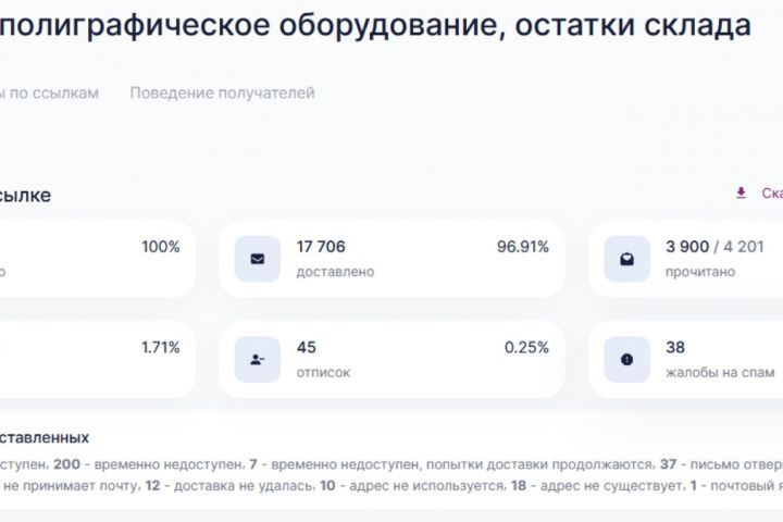 https://i.postimg.cc/Ss7YrnP3/77.jpg + получите список адресов в Ексель: https://ibb.co/M8g6jfk , со статусом доставки, т.е. возле каждого майла будет написан статус, как: доставлено, прочитано, переход по ссылке, доставка не удалась, жалоба на спам, не доставлено, отписался от рассылки.