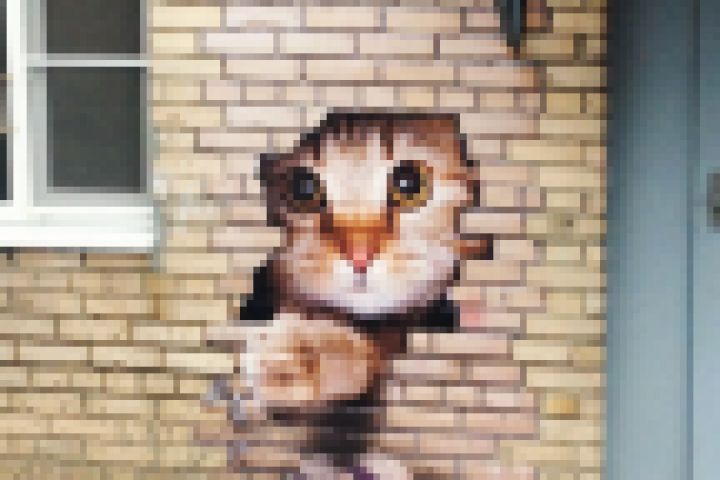 По заданию руководства был разработан дизайн стенной самоклейки из имеющихся графических материалов. Стена сфотографирована, котенок изначально лез через разорванную бумагу, кирпичи внизу - из отдельной оперы.