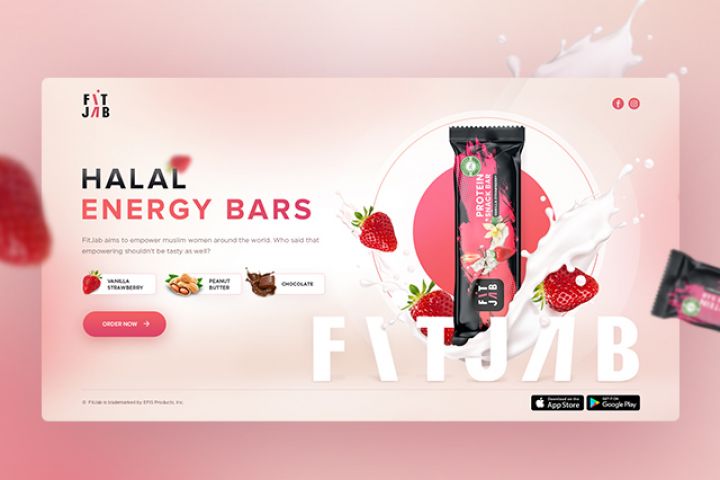 Landing page по продаже энергетических батончиков "Fitjab" с выборами вкусов.
