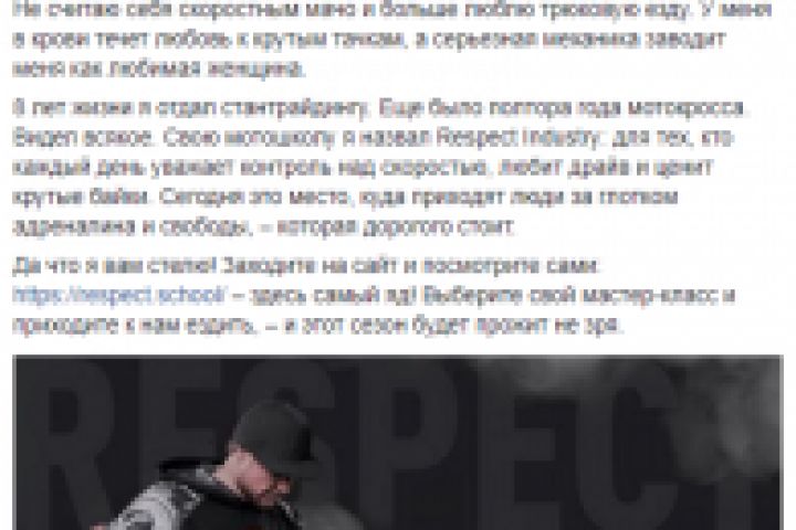 Пост для мотошколы Respect Industry на Фейсбук
