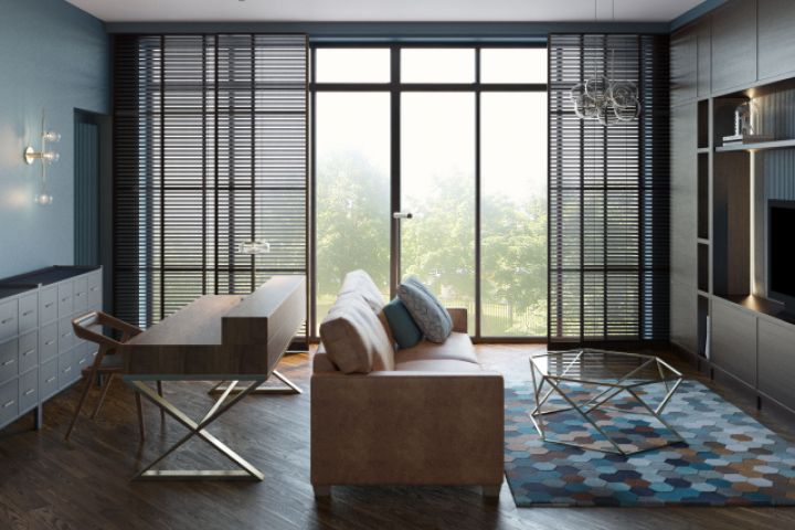 Этот просторный кабинет с великолепным панорамным окном выполнен в насыщенной цветовой гамме, которая, совместно с лаконичной строгостью мебели и напольного покрытия из натурального дерева, создаёт атмосферу, в которой можно и плодотворно поработать, и расслабиться после рабочего дня. Скрытые двери, ведущие в смежные спальню и гардеробную, не привлекают внимания и не разбивают общую картину. Изящные современные светильники создают гибкую систему локального освещения, подстраивающуюся под нужды хозяина кабинета.