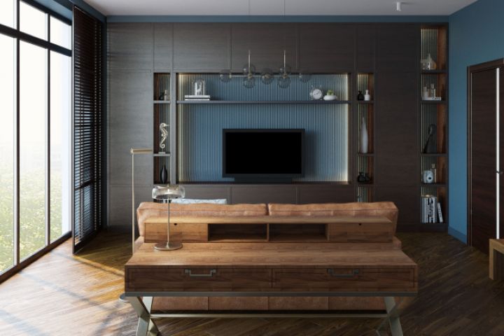 Этот просторный кабинет с великолепным панорамным окном выполнен в насыщенной цветовой гамме, которая, совместно с лаконичной строгостью мебели и напольного покрытия из натурального дерева, создаёт атмосферу, в которой можно и плодотворно поработать, и расслабиться после рабочего дня. Скрытые двери, ведущие в смежные спальню и гардеробную, не привлекают внимания и не разбивают общую картину. Изящные современные светильники создают гибкую систему локального освещения, подстраивающуюся под нужды хозяина кабинета.