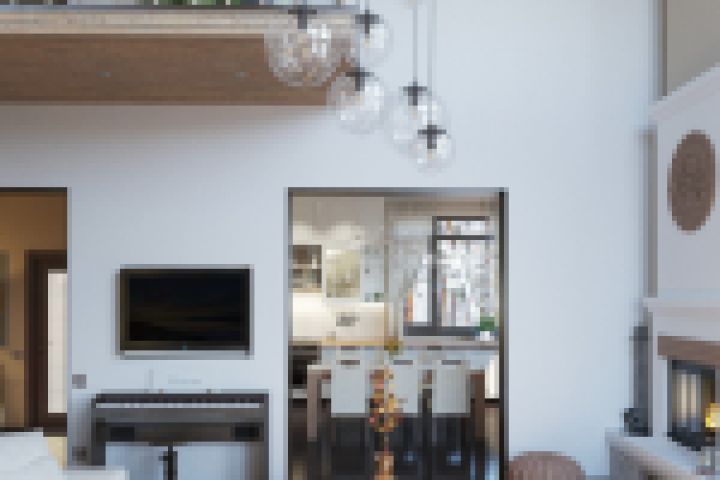 Двухсветная гостиная с открытой планировкой. Объединена с пространством кухни-столовой.