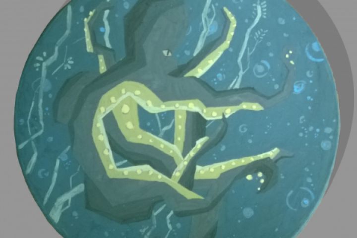 Декоративная композиция "Осьминог". Выполнена цветным ангобами и глазурями, на керамической тарелке из шамотной глины.