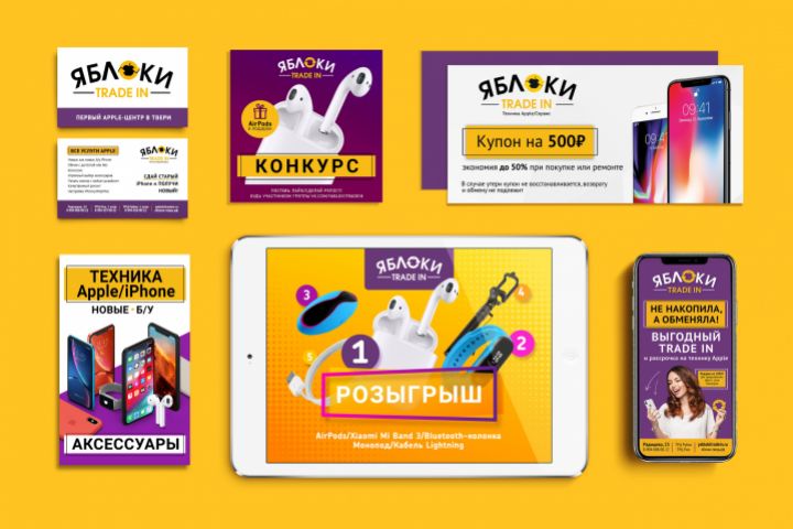 Разработка и постоянное ведение всей рекламной продукции для Apple-центра «Яблоки. Trade in». Яркий и эмоциональный фирменный стиль привлекает внимание пользователей техники Apple и позволяет компании оставаться популярной в своем сегменте в г. Тверь.
